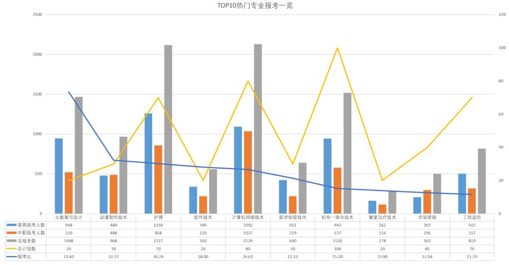 我们梳理了2022年分类考试中我校报考热度最高的10个专业(1志愿报考专业),便于考生和家长客观、理性地看待录取结果。